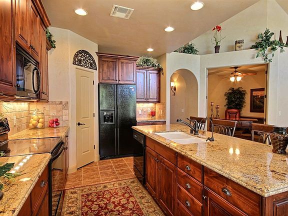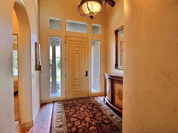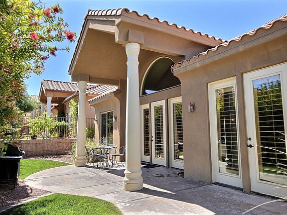This gorgeous home is located in Villa La Paz, a quaint community with a unique Tuscan flare. Surrounded by the Falcon Ridge and Oasis Golf Course, this small circle of homes is conveniently located north of I-15. This former model has had very little use and is beautifully appointed throughout. The floor plan is open and bright with grand windows and soaring ceilings. Unique wood like beams accent the 14' ceilings and the wall texture and paint tones are gorgeous. The kitchen has high quality cabinets, granite counter tops, a decorative tile backsplash and premium bronze plumbing fixtures. The walk-in pantry is spacious and ideal for storage. The den has glass French doors and is ideally positioned off the great room. The Plantation Shutters throughout the home are exceptional and the bronze hardware is superb. The bathrooms have tile surrounds and costly lighting. The yard is surrounded by mature shrubs and trees providing ample privacy. The stained exterior concrete is attractive.