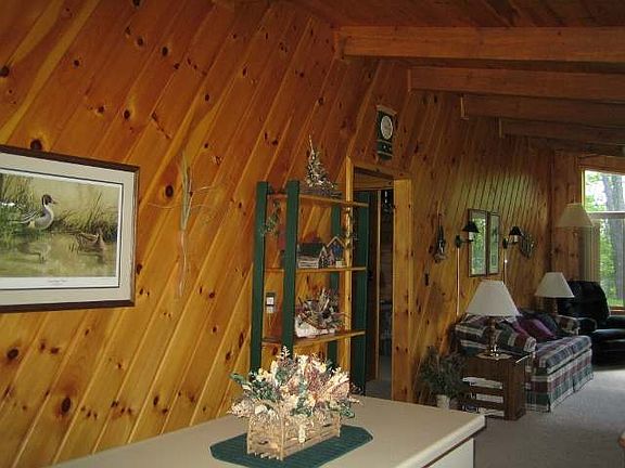 Very charming log sided home featuring 200' of level, park like frontage on Fisher Lake, a 3- lake chain! There is extensive landscaping throughout the grounds and an attractive walkway leading to the level, private sand frontage. A lakeside covered porch stretches across the home and a large open sun deck faces the water. Inside, you'll find an open kitchen, dining, living area, complete with beautiful tongue and groove knotty pine walls and cathedral ceiling with large beams. There is a zero clearance freestanding wood burning fireplace and large waterfront patio door. 2 spacious bedrooms and large full bath complete the home. Extremely well cared for, located at the end of a dead end road, truly a beautiful Northwood's home!