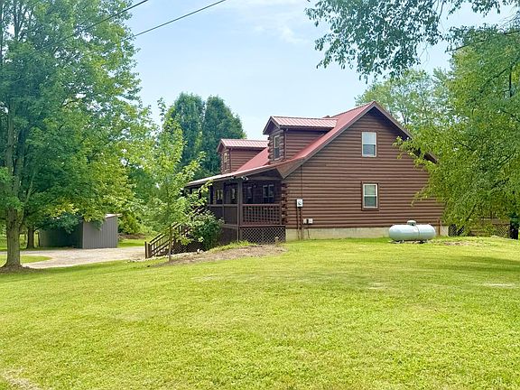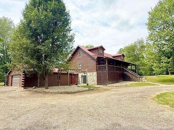 2,316 Sq. Ft. Log Home with an additional 1,600 Sq. Ft. Finished Walk-Out Basement. Beautifully updated 4 bedroom, 3.5 bath log home on a quiet paved country road. Enjoy the charm of a full-length covered porch and back deck, perfect for relaxing evenings. Inside, the home features soaring ceilings in the living room and kitchen with 9-ft ceilings throughout, including the basement. The main floor offers a spacious owner's suite, an additional bedroom with an attached bath, plus a convenient main floor laundry room. Upstairs you'll find another bedroom and a flexible bonus room for a home office, den, or 4th bedroom. All bedrooms include large walk-in closets. The fully finished walk-out basement provides excellent extra living space, while the oversized insulated 2-car garage and shed for livestock or storage add convenience. Many updates throughout including recently stained and sealed logs. Move-in ready, peaceful setting, and plenty of space to unwind—this home has it all!