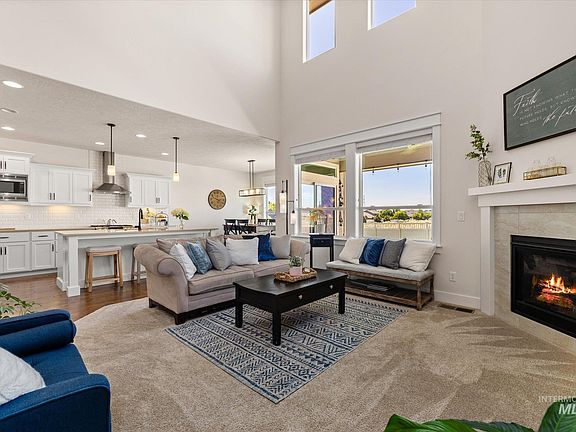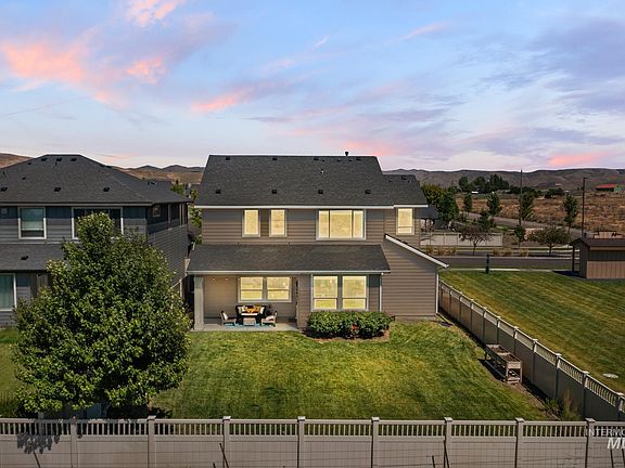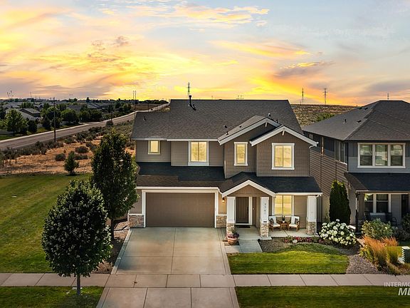 Custom built by local builder, Berkeley Building Company, this nearly new home offers sweeping views of the foothills & valley. Amazing sunsets off the covered patio. Close access to the Oregon Trail walking paths. A great room w/fireplace, & two-story ceilings flooded with natural light. Attention to detail exudes throughout w/engineered hardwoods, quartz counters & designer tilework. The pristine kitchen boasts an expansive island, breakfast bar, pantry, stainless appliances & under cabinet lighting. Generously sized primary suite features a large picture window, an ensuite bathroom w/dual vanities and soaker tub, plus walk-in closet. Enjoy the fully fenced, private backyard with no backyard or side neighbors, & mature landscaping. A full three car tandem garage is perfect for toy storage and has epoxy floors. Just minutes to Micron & only a few miles to the Boise River, Lucky Peak Reservoir & parks. Lot behind property is zoned RUT w/ no development plans. Garage fridge and patio furniture to be included.