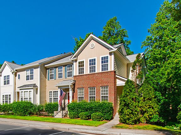 Welcome to this desirable end-unit townhome in sought-after Alexander Place in Brier Creek, offering a rare basement floor plan and a private setting that backs to mature hardwoods. Enjoy two assigned parking spots and additional guest parking sprinkled throughout the neighborhood. The main level features tongue and groove hardwoods, fresh neutral paint, and a cozy family room anchored by a gas fireplace. Sliding glass doors open to a generously sized balcony deck, perfect for grilling and entertaining, while the walk-out basement patio offers even more outdoor living. The kitchen is both stylish and functional, featuring a large pantry with a sliding barn door, ample cabinetry, and a kitchen island offering extra prep space and storage. Upstairs you'll find dual primary suite options, each with ensuite bathrooms and spacious walk-in closets—one suite boasting two closets for added convenience. Plush carpet adds comfort to the upper-level bedrooms and hallways, and accordion shades on the bedroom windows provide extra privacy. A second-floor laundry closet adds everyday ease. The finished basement is a standout, featuring a spacious family room with a gas fireplace, a full updated bathroom, and a large closet—making it perfect for a media room, playroom, or private guest retreat. Just off this space, the adjacent unfinished room is already set up as a full home gym. Whether used for fitness, a workshop, or added storage, this flexible area adds incredible value and versatility. Additional highlights include a new roof (2023), new water heater (2024), beautifully framed windows that add architectural charm throughout, and low-maintenance living thanks to the HOA, which covers exterior maintenance and landscaping. Community amenities include a pool and clubhouse. Located just minutes from Brier Creek's open-air shopping, dining, and entertainment, with quick access to grocery stores and daily conveniences. Less than 10 minutes to Umstead State Park's miles of trails for hiking, biking, and exploring. Easy access to I-540 and US-70 offers a quick commute anywhere in the Triangle. Don't miss this rare townhome offering end-unit privacy, wooded views, and flexible unfinished basement space ready to suit your lifestyle! Opportunity to qualify for up to $15,000 in down payment assistance and $5,000 closing cost assistance with First National Bank; please inquire with agent for details.