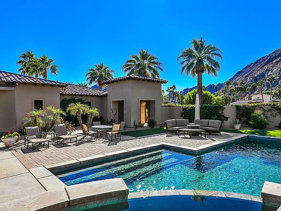 Exceptional designer furnished estate home built in 2005 by renowned Minisitrelli Homes located within prestigious Villaggio community at Indian Wells CC on spectacular 19,602 Sq. Ft. lot with panoramic south mountain views. Home has 3975 Sq.Ft. of interior space, 4 bedrooms and ensuite baths, 3 car garage, 3 fireplaces. Large front lawn, gated courtyard entry into absolute relaxation, showcasing large pebble tech sparkling pool/ spa with cascading waterfall, artificial grass, paved walkways, indigenous plants, palm trees, lounge areas with seating, and privacy galore. Spacious backyard is also meticulously landscaped! Stunning door entry into beautiful home that boasts high ceilings, polished travertine floors, Crown molding, abundant recessed lighting, and gorgeous fixtures with too many outstanding upgrades to mention them all. Open Living Room features stonecast fireplace, built-in custom glass shelves and cabinetry, formal Dining Room with unique built in granite countertop buffet. Large step-down Wet Bar has refrigerator, granite countertops, and bar seating for great entertainment. Family Room has glass tiled fireplace and adjacent is Gourmet Kitchen complete with big island, granite countertops, Wolf 6 -burner stove-top, Sub-zero refrigerator, and walk-in pantry. Primary Bedroom Suite has incredible mountain and pool views, large sitting area, fireplace. Primary Bath features marble countertops, dual sinks plus vanity, shower, jet tub, large walk-in custom closet.