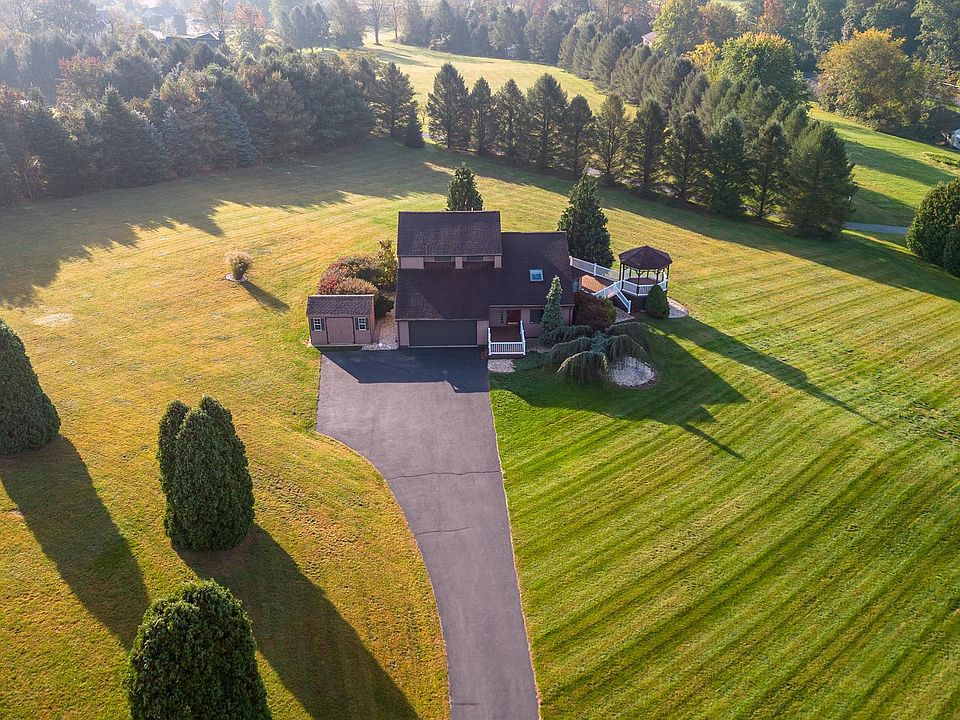 Going down the drive to this 4-bedroom, 2 full bath Contemporary home you would think you are the only home around. Entering the home from the front porch you can see straight to the rear yard thru the glass sliders where all you see in the distance are trees. Kitchen is to the right with luxury plank flooring, Granite counters, Glass tiled backsplash, under-counter lights, stainless appliances, and custom cabinetry some with glass fronts and interior lighting. Cabinets on the interior wall have a breakfast bar below that easily fits 2 stools. The double door cabinets have large pull out shelves for storage of pots and pans. Track lighting with LED bulbs brighten up this space. The Great Room has the Dining area and Family/Living Room space. There are 2 sets of glass sliding doors on either side to enter onto the large wrap around Trex deck with Gazebo. High Wall windows allow for extra lighting into this space. Completing the main level is the Primary bedroom with 2 sets of sliding door closets and access to the Primary/hall bath complete with Jacuzzi tub, stall shower, single bowl vanity, luxury vinyl plank floor and wall mirror. Upstairs you will find 3 bedrooms – one currently used as an office. The two other bedrooms have lighted ceiling fan and large closet space with sliding mirrored doors. Completing this floor is the hall bath with tub/shower combo, linen closet and single bowl vanity. The almost full size Basement is unfinished waiting for your touch to complete. The rear portion has the laundry area – washer and dryer stay – and access to the rear yard via steps thru the bilco doors. Spend your evenings on the expansive deck and on those warmer days open the electric awning to keep cool. Listen to music in the Gazebo that is wired for speakers. The Garage is oversized, has plenty of space for additional storage on the shelving along with access above for storage – area is finished with plywood floors. Also, included is the shed that will house all your outdoor equipment and furniture. Come sit on the rear deck to enjoy the solitude that most of us miss on a daily basis… Don’t miss viewing this home… Schedule your visit today!