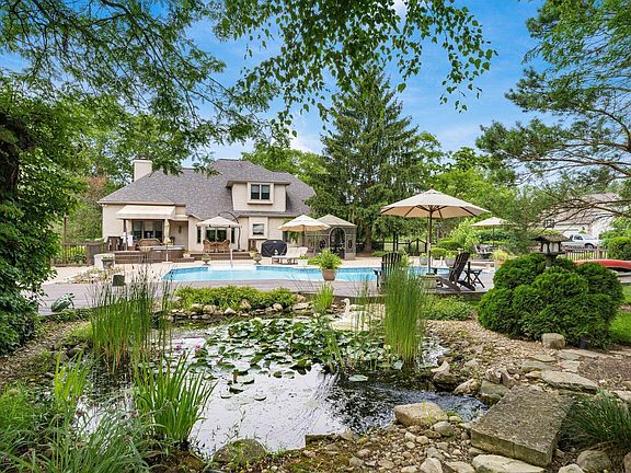 Pristine custom one owner retreat on 1.3 acres. This property features 12 ft ceilings on the main level & custom built-ins throughout. A 1st floor primary plus three additional bedrooms upstairs, one w/an en-suite & the other two sharing a jack & jill. Main level includes a formal dining rm & fully appointed kitchen w/center island & new appliances. Formal living & great rooms are adorned w/a two sided fireplace & custom crown molding. Basement offers a wine room, fully equipped bar w/multiple beverage coolers, a full bath, generous entertaining area, a work out room & walk up. The exterior of this home is the real show stopper w/multiple entertaining areas, a koi pond, water feature, a lazy Grecian L shaped inground pool w/deep end & a pool shed w/full bath. This is a lifestyle property!