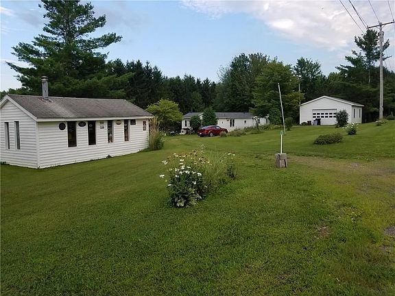 Nearly 3 acres of beautifully landscaped land surrounds this 2/3 bedroom mobile home. Fruit trees and berry bushes line the property and you'll also find a pond on the edge of the property. Home has open landscaping but is also surrounded by pine trees to ensure privacy. 2 garages on each side of the driveway, 1 garage has ability to place a wood or pellet stove to heat if desired. Can either use furnace or wood stove to heat the entire home.
