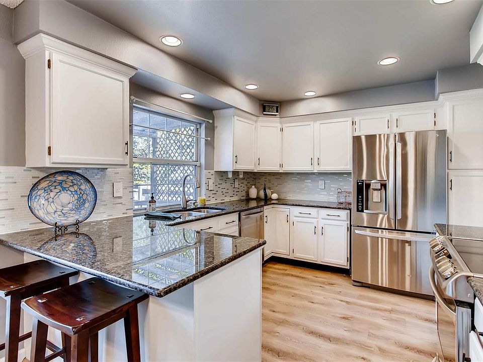 LOWER Price and NEW commercial-grade concrete garage floor, driveway, and walkways! Beautifully updated home with spacious, open floor plan, vaulted ceilings, skylights and luxury vinyl plank flooring. Updated kitchen has granite countertops, deep double-sink with touchless faucet, and LG stainless-steel appliances. Large master bedroom offers a cathedral ceiling, skylights, and a cedar-floored walk-in closet. Master bath with over-sized shower, 10-inch rain showerhead and a custom double-sink vanity with granite slab countertop. Finished basement includes 4th bedroom, ¾ bath, wet bar for entertaining, laundry room and rec room. Newer roof and central A/C include transferable warranties. 15-month transferable Buyer's Home Warranty. Short walk to Ken-Caryl Ranch House, community pool, tennis and green belt. Over 45 miles of private trails, acres of open space, 3 pools, indoor/outdoor tennis, equestrian center, rec programs, very low HOA. Easy access to C-470 and award-winning schools.