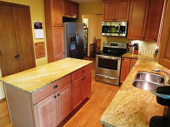 Don't miss this! Kitchen has been totally renovated with 42'' solid maple cabinets, granite countertops, tile backsplash, center island, and stainless steel appliances! Updated - Furnace, A.C., Rosati Windows, SS Appliances. The dinette area has sliding glass doors out to patio, hardwood floors on first level, family rm with brick wood burning fireplace & built-in bookshelves, dining rm, living rm/den and half bath. Spacious upper level master bedroom w/ ceiling fan and a half bath adjoining full hall bath, two other upper level bedrooms. Basement has full bath, rec rm, 4th bedroom, utility rm and additional storage space. Beautiful backyard with privacy fence, large patio, and mature trees.