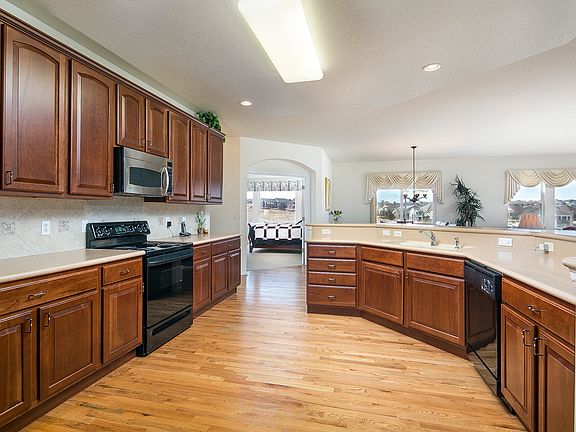 EXPANSIVE VIEWS! Situated on a low maintenance half acre lot, this updated home overlooks the 13th and 17th fairways and showcases stunning golf course and open space views. You'll love the thoughtful finishes, spacious floor plan, abundant natural light, professionally landscaped yard, and covered trex deck, ideal for entertaining and relaxation. Freshly painted inside and out, new appliances, walk-in closets in every bedroom, updated baths, fabulous main-floor office, walk-out basement, and so much more. Located in prestigious Heritage Eagle Bend, this 45+ community includes impressive amenities such as a newly renovated clubhouse; fitness center; indoor and outdoor pools; onsite restaurant/bar; social clubs; craft room; bocce ball, pickle ball, and tennis courts; and of course, a fabulous 18-hole golf course. Welcome home!