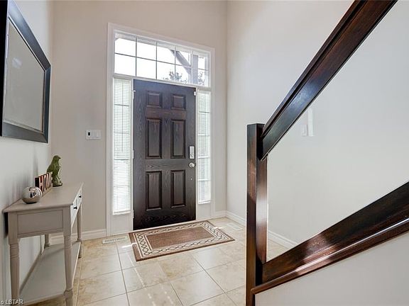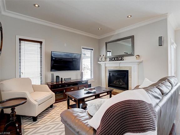 Stunning turn key opportunity with walkout basement and spectacular views backing onto the pond in desirable Byron! Spacious open concept main level with plenty of windows and a large second storey deck provide an ideal layout for entertaining, watching the sunset, viewing the pond/greenspace or catching the Byron fireworks. Inside you will find stunning modern finishes including crown mouldings, extraordinary light fixtures, pot lights, a gas fireplace, glass staircase, 9 foot ceilings on the main floor and a vaulted ceiling in one of the bedrooms, fresh bright paint and hardwood and ceramic flooring. The second level will be sure to impress with three large bedrooms and two ensuites! Master bedroom overlooks the ponds and features a 5 piece ensuite with his and her sinks, soaker tub, glass shower with rain head and walk in closet. The additional bedrooms share a separate 4 piece ensuite with modern fixtures! Recently finished lower level complete with a wet bar and walkout basement. Pride of ownership is evident and shows like new! Quality architectural shingles. Rare opportunity to live with private backyard!