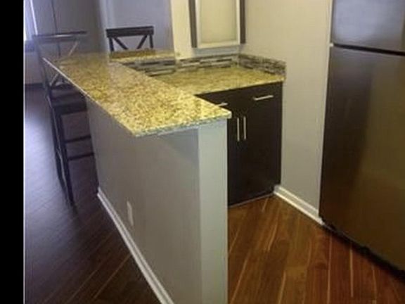 Open kitchen with granite countertop and a large bar area. A great area for entertaining.