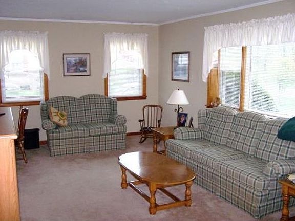 Spotless 2 bedroom ranch with a bonus walk-up attic & finished basement has new appliances, breezeway to detached 2-car garage, vinyl windows, HW floors e all on a beautiful 1/2 acre. Photos at gerbeshomes.com/466452