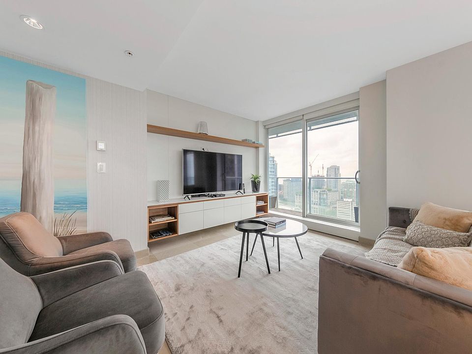 Incredible two bedroom & flex home in downtown's most desirable high rise. This north west facing two bedroom & flex home comes with a 265 square foot wrap around balcony. Featuring spacious living area, gourmet kitchen with Miele appliances, entertainment sized living area, separated bedrooms, curtain wall system to maximize views, marble hardwood flooring throughout, A/C and endless city mountain & water views. Please note: Bed setup: 2 x Queens, plus 2 x twin size air mattresses (linens included for the air mattresses) Free parking: available on location (underground secure) Furnished units are not available to rent unfurnished. Included: linens, towels, cable TV (basic), Wifi Internet (free), washer/dryer (on suite), full kitchen, and AC (portable or central). NOT included: Toiletries, condiments (salt, pepper, ketchup, etc.), soap, dishwasher detergent, laundry detergent, toilet paper (2 rolls are complimentary upon arrival), and paper towels * 30 day minimum rental period * Security deposit required * No Smoking * No Pets * References required There is a onetime cleaning fee of $375 and a onetime move-in fee of $300 All reservations will be confirmed within 24 hours after booking Minimum rental age is: 25 We do NOT host events/parties/overnights in our suites at the moment All prices are subject to change without notice prior to booking. We reserve the right to decline a booking Disclaimer: While every effort has been made to provide current and accurate information presented on the listing, aesthetic features such as furnishings, are subject to change at any time. Please schedule a viewing or request a virtual tour of the unit to see a current representation.