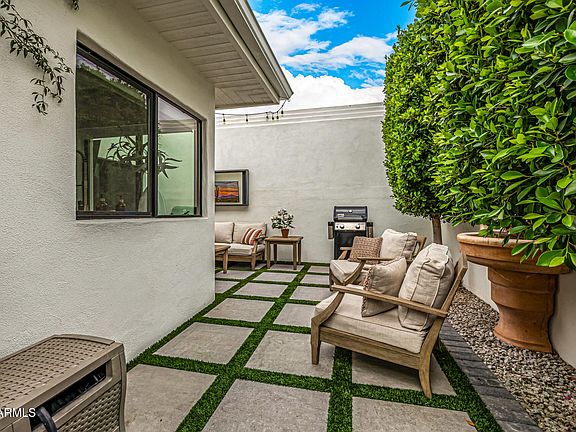 Stunning two-way fireplaceSerene primary suiteWall ovenBreakfast barCharming courtyard entryStylish tile backsplashCrisp white cabinetry