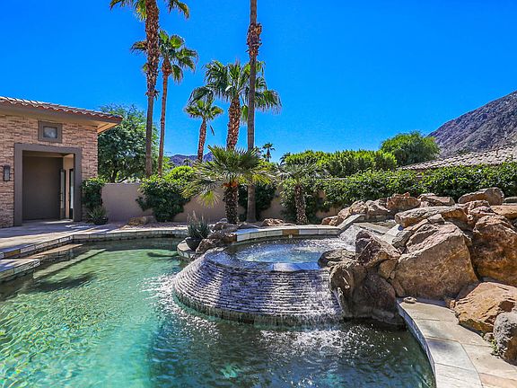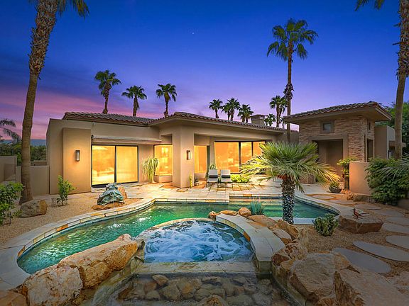 Exceptional, semi-custom Designer Furnished including famous Christopher Guy Design recently upgraded, modernized and contemporary built by famed Ministrelli in 2004 in prestigious Villaggio community at Indian Wells CC. New landscaping of synthetic turf and attractive trees. Breathtaking south facing views of Santa Rosa Mts., gorgeous Pool/Spa and Waterfall, and large private gated Courtyard entry with slate stone flooring. Spectacular north facing views on 5th fairway of the Cove Course. Open floor plan, travertine floors, high ceilings, modern ceiling fans, abundance of recessed lighting, 3164 Sq. Ft., 3 bed with ensuite baths, 3.5 bath, 2 car plus golf cart A/C garage, large home office with gorgeous custom cabinetry and beautiful views. Spacious covered loggia remodeled for great outdoor entertaining includes ledge rock fireplace, flatscreen, granite counters, wet bar with stainless sink, and beverage bar. Open Great Room features ledge rock wall, built-in custom cabinetry, fireplace, flatscreen, Fleetwood sliding glass doors open to pool/spa. Remodeled Gourmet Kitchen showcases new Quartzite countertops, big center Island with lots of storage, walk-in pantry, custom modern lighting. Formal Dining area has stunning contemporary chandelier. Primary Bedroom with awesome mountain/ pool views; Master Bath with dual walk-in closets, dual sinks, vanity, travertine countertops, jet tub, and large shower. Awesome craftsmanship and Design with first class furnishings!