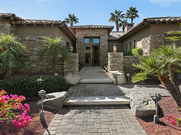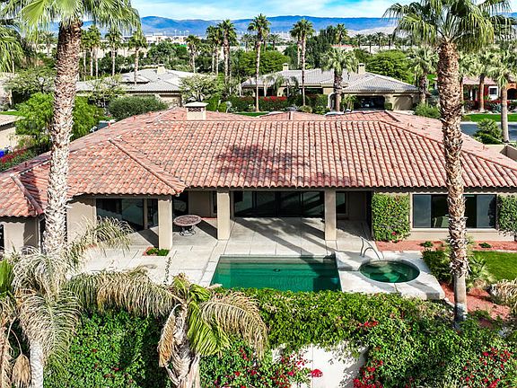 Welcome to this outstanding designer furnished, Tuscany inspired, semi-custom home built by renowned Ministrelli within exclusive Villaggio community at Indian Wells Country Club. Beautiful pavered driveway and walkways into courtyard entry of this gorgeous 3749 Sq. Ft. home, 4 bedrooms, 4 baths ensuite, plus Powder bath, home office, and 3 car garage. South facing home features new landscaping, large pebble tech pool/spa, mountain views, covered patio with built-in BBQ island, wonderful for entertaining! Open floor plan, high ceilings, Versailles pattern travertine floors throughout, stone baseboards and neutral carpets in bedrooms, Great Room and Dining Room. Great Room with pool and mountain views has built-in custom media center. Formal Dining has wet bar and serving area with granite countertops. Gourmet Kitchen has stainless Wolf appliances, Sub-zero refrigerator, 6 burners with grill stovetop, beautiful granite countertops and full backsplash, large island with bar seating and pantry. The Family Room adjoins the Kitchen with stonecast fireplace and custom built-ins. Private Primary Bedroom Suite features beautiful views, steps away from the sparkling pool/spa. Elegant Primary Bath has two walk-in closets, dual vanities, marble countertops, large glass shower, and jet tub.. Desert Living at its finest! Low HOA.