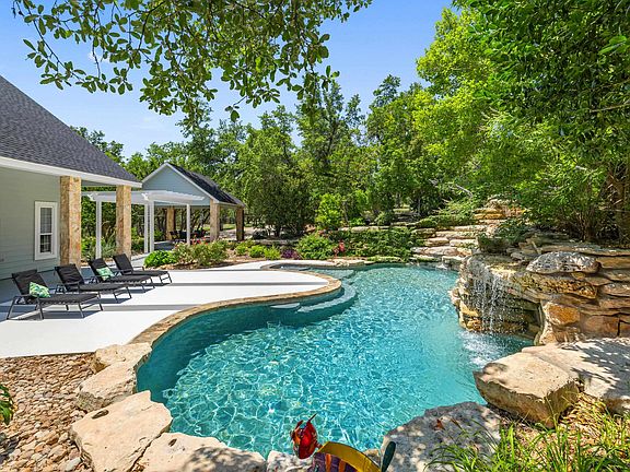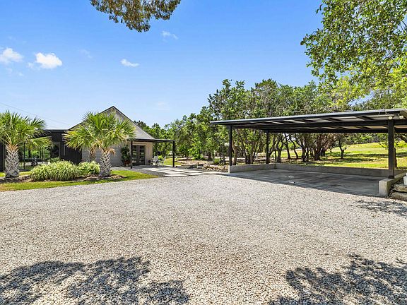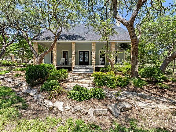 Nestled in the heart of the Texas Hill Country, this breathtaking rural estate spans 25.59+/- acres, offering endless possibilities for enjoyment. The main house, covering 3,200 square feet, features 5 bedrooms and 3.5 baths. With soaring 20 and 9 ceilings and two dining areas, it exudes spaciousness and elegance. A wide front porch overlooks serene, scenic views, perfect for relaxation. Inside, the chef’s kitchen is a dream come true with custom cabinetry, a gas cooktop, quartz countertops, a large island, and a cozy breakfast area with a fireplace. Throughout the home, you'll find beautifully crafted, upscale features. Outside, a covered patio opens to a stunning swimming pool, complete with a rock wall, waterfalls, and a slide. The estate offers multiple outdoor dining and relaxation areas, along with a paved carport. High fencing surrounds the home and pool and home area. The guest house, approximately 2,200 square feet, includes 2 bedrooms, 2 bathrooms, 2 living areas, and a dining area. Custom metal and pine stairs lead to the loft. The kitchen is newly updated with quartz countertops, a large island, pine ceilings, and walls of retractable floor-to-ceiling glass doors that seamlessly blend indoor and outdoor living. Like the main house, the guest house features custom, high-end designs and inviting outdoor areas, along with a nearby 3-car carport.