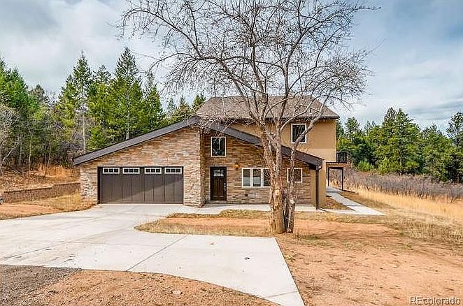 Wonderful opportunity to own a views only Colorado can provide! Completely rebuilt and remodeled home. Everything is new, new roof, new propane, new septic, new well, new kitchen, new bathrooms, only the shell was original and that is covered with beautiful stucco! Brand new constructed garage. Gravel driveway from street with a heated concrete pad in front of garage! Both bedrooms upstairs have their own bathrooms. Master suite includes massive walk-in closet and a private deck facing the mountains. Second bedroom also has its own bathroom. Ground floor bedroom is great for visitors, no stairs required! Full bath also on main level. Basement has a bonus 4th bedroom. Hardwood floors in great room! 15 short minutes from Castle Rock to your private mountain retreat! All new windows with a clerestory of windows added lets in all the natural light.