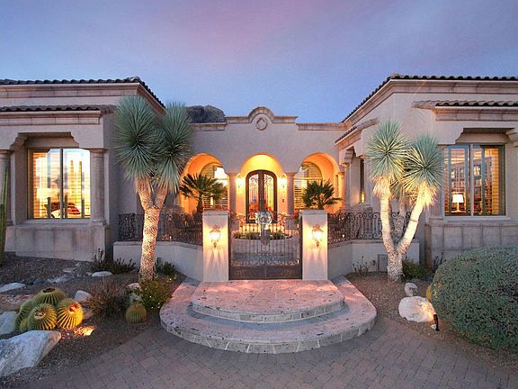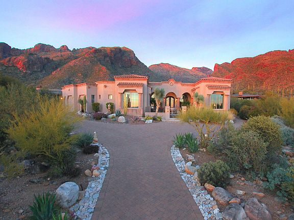 This extraordinary all-masonry custom home thoughtfully designed and built by premier builder, Bill Diamond, is offered for the first time in the coveted gated community of Pima Canyon Estates. Enter home through gated cantera stone courtyard into open living room/dining room w/spectacular Catalina Mtn views. The home incorporates state-of-the-art functionality with amenities that boast second master suite, large studio and spacious chef's kitchen adjoining family room with massive fireplace w/custom carved wood mantle. The perfectly proportioned rooms have high ceilings, viga beams in living & dining rooms, all bedrooms w/ensuite baths & Tera Rosa ceramic flooring throughout home. Entertain in resort style all Cantera stone back yard patio & pool area w/built-in FP & BBQ.