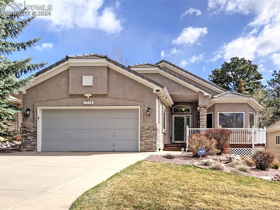 Introducing a charming ranch-style home featuring 3 bedrooms, 3 bathrooms, and 3,470 square feet of living space nestled in the highly sought after Village at Peregrine Community. This inviting residence includes a 2-car garage and showcases a stucco exterior with a spacious front porch and a large covered deck at the back. Inside, the main floor boasts vaulted ceilings, skylights and large architectural archways that create a sense of openness and airiness throughout the living spaces. The primary bedroom is conveniently located on the main level with an attached 5 pc bath & walk in closet. The open floor plan enhances the flow between the kitchen, dining area, and living room, providing a welcoming atmosphere ideal for daily living and entertaining. The lower level offers a large recreation room, bedroom and full bath as well as a large storage area with shelving. This well-maintained ranch home offers a perfect blend of modern amenities and classic charm, making it an attractive choice for those seeking a peaceful and spacious living environment. Located in close proximity to the District 20 Elementary School, neighborhood park tennis courts, Blodgett Open space & other hiking trails.