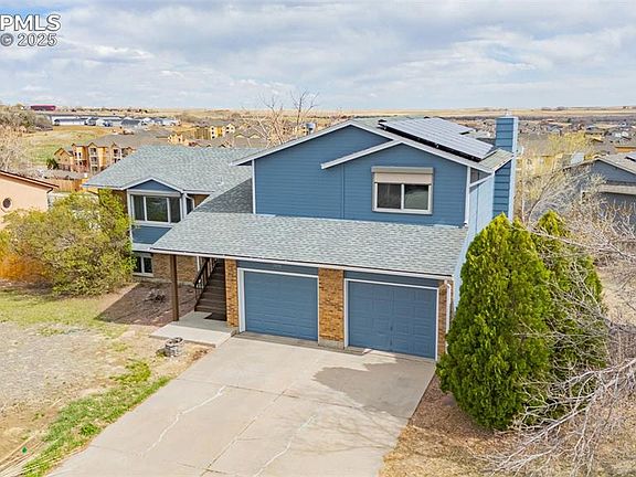 Welcome to this 5-bedroom, 3-bath move-in ready home, complete with paid-off solar panels! Situated on a spacious 0.28-acre corner lot in Colorado Springs, this home offers impressive space and versatility. The main level features a generous family room, a formal dining area, and a bright eat-in kitchen. Upstairs, you'll find two bedrooms, a full bathroom, and a master suite with its own private bath and walk-in closet. The lower level offers another large family room with a cozy fireplace and direct access to a beautiful wooden deck—perfect for entertaining. The basement includes two additional bedrooms, a fully updated bathroom with a lifetime warranty, and a flexible living area that also opens to the deck. Enjoy the fresh paint and new flooring throughout the upper and lower levels, along with brand-new carpet and paint in the basement. Additional upgrades include a water softener and purifier, plus a shed and garden beds in the backyard. This home is packed with features and ready for you to make it your own!