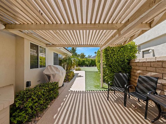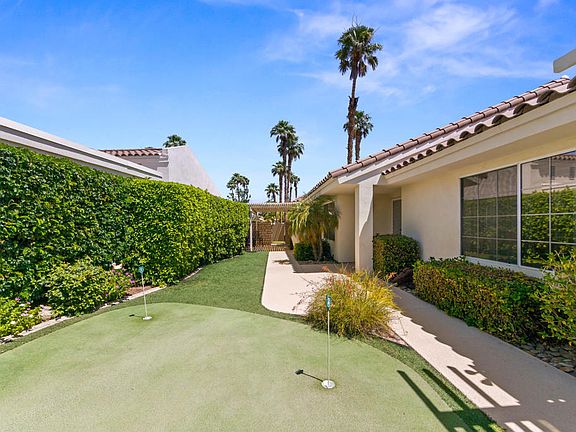 Beautifully appointed, updated 3 bedroom (3rd bedroom used as den. Closet could easily be restored.)., 2 bath, home in a perfect Desert location just a block from the Indian Wells Tennis Garden, close to shopping, restaurants, movie theaters and much more! Large, updated kitchen with eating area and conveniently adjacent dining room. Spacious living room is centered around a gas log fireplace with access to the patio through French doors. Low maintenance yard with fruit trees and covered, large patio are South facing. You can enjoy the sun all day long! You and your guests will have fun playing the 9 hole putting green (and included putters!). Oversize primary bedroom is en-suite and opens onto updated bath with walk-in shower, soaking tub, double-sink vanity with extra storage and large, walk-in closet. Nice size guest room and adjacent, updated guest bath. Den/office has built-in bookshelves, workspace and can provide overflow sleeping. Home is offered tastefully furnished per inventory. Skylights bring added light into the home. Double car garage with direct access. Use of the recently remodeled club house with full gym, tennis and pickle ball courts, 5 community pools/spas are included in your monthly HOA's, no separate membership fee. Move in ready!
