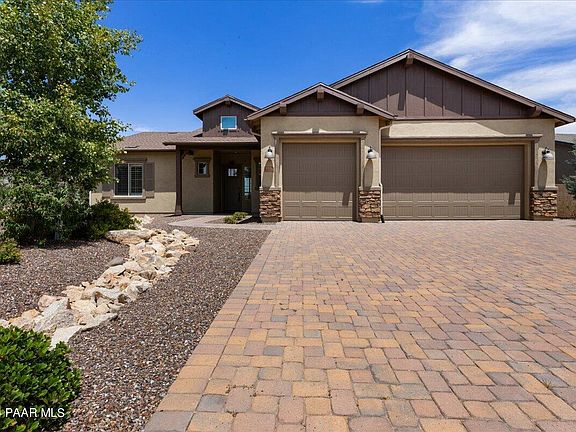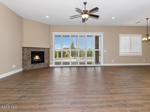 Beautiful, like new 3 bedroom, 2 bath, 3 car garage home on a corner lot with common area behind home. No home to be built behind. Lush landscaping in both front and backyard, storage shed in rear yard, covered paver patio, water softener, gourmet kitchen, soft close hinges on cabinets, quartz counter tops, under cabinet lighting, breakfast bar, fireplace, plantation shutters throughout, brand new carpet in bedrooms, larger walk in shower in primary bath, oversized secondary bedrooms, 5 and a quarter base boards, and wood tile flooring in common areas. Located in the desirable Pronghorn Ranch community, two community pools, spa, pickle ball, parks, and gym. Easy access to all the Prescott and Prescott Valley area has to offer. A beautiful, private home.