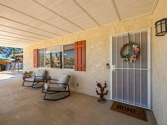 Are you feeling lucky? Or maybe you are looking for some luck? Here is your opportunity - you can't beat an address with 4 7's in it, combined with a lucky horseshoe set in the walkway- you are off to a great start! Located in desirable neighborhood in south west Yucca Valley. The curb appeal grabbed me as soon as I approached, oversized circle drive, tasteful desertscape complete with Joshua Tree. Charming front porch and yes , they have their rockers out to enjoy those panoramic western mountain views. Enter spacious living room with beam ceiling and floor to ceiling brick fireplace. Spacious dining area and kitchen with loads of storage. Slider access of dining area to spacious enclosed rear yard with covered patio and yep you got it another Joshua Tree as part of the mix. Home feels larger than sq. ft listed due to well thought out floorplan with minimal space dedicated to only one hallway with bedrooms on each end and full bath in between. Primary suite is spacious with plenty of closet space and barn door entry to ensuite. Second bedroom also spacious and both have ceiling fans. Double car attached garage with laundry area, RV/Boat/Toy gated parking . This has been a wonderful starter home for the current family job transfer is reason for sale. Well maintained and situated on almost 1/2 acre lot . Be the next lucky homeowner and get this home on your tour.