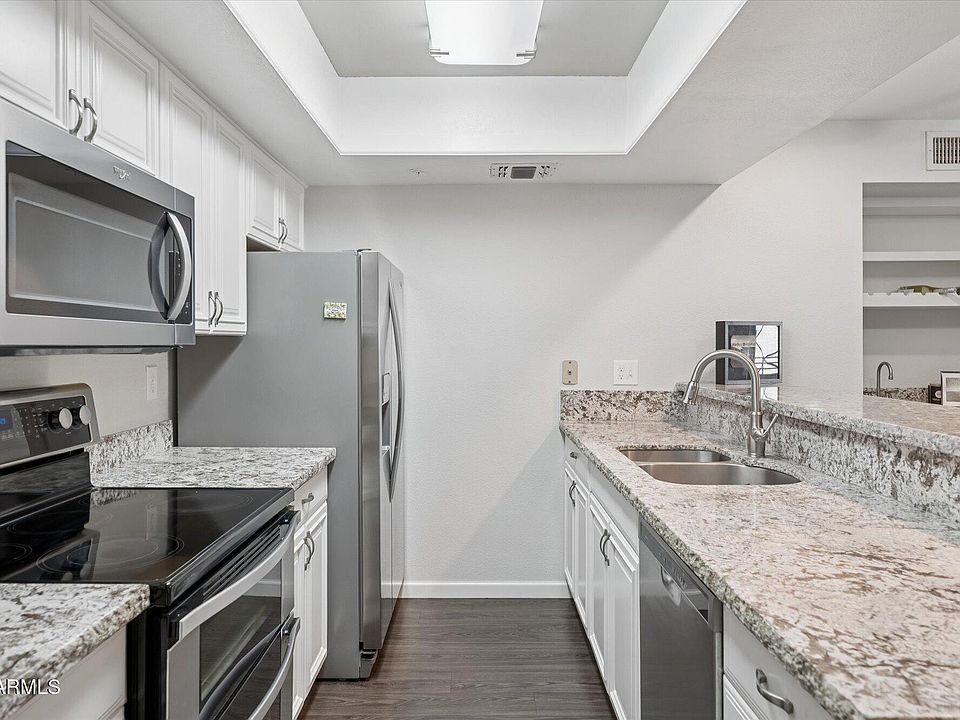 Spacious 2BD/2BA condo in the heart of Old Town Scottsdale! Both bedrooms are large enough for a bed and desk; the primary features an en suite bath. Enjoy updated stainless steel appliances, freshly painted cabinets, walk-in pantry, wet bar, and in-unit washer/dryer. Natural light fills the open layout, and the private balcony offers a perfect retreat. This unit is just walking distance from one of the two pools and spas available to its residents. Walk to Scottsdale's top attractions—Giants spring training, Fashion Square Mall, dining, and more. Come and see!