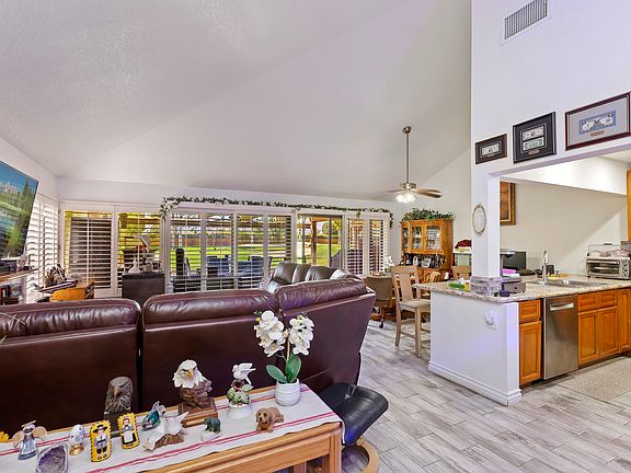 Mountain views from the open patio overlooking the 3rd hole tee box. This well priced unit has many upgrades which include ceramic tile floor with a wooden appearance, granite counters in kitchen and bathrooms, hallway bathroom converted to shower only improved lighting in kitchen and a very large pantry. The ceramic tile flooring is throughout the home, plantation shutters throughout and vaulted ceilings. The large master bedroom has direct garage access, with the buyer's accepting that access to be 'as is', no fire door is installed. Added square footage is an area above the kitchen with pull down stairway for access. All furniture in the 'loft' except for the roll top desk included in the sale at no cost to the buyer. The patio table with the firepit and chairs are also included in the sale. Each bathroom has a full shower with no tub.