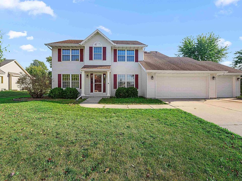 Expansive 4+ bedroom, 2.5 bath home offering just over 3,000 sq ft. Updates include Brazilian Teak hardwood floors in the foyer, dining room, living room, and half bath (2023). The huge kitchen offers tons of storage, an eat-in area, and a great room w/wood-burning fireplace and deck access. A formal dining room and main level laundry, which features a dog/utility shower (2022), complete the main floor. Your 3+ car heated garage also offers low-maintenance epoxy floors, a separate electrical panel, and insulated walls, allowing for projects year-round. Upstairs, the spacious primary suite includes a large walk-in closet & attached bath with dual vanities & a jetted tub. The finished lower level boasts a wet bar, family room, and den, plus storage galore! (plumbed for additional toilet).