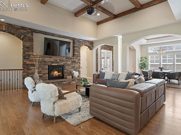 This beautiful ranch-style home in "The Hidden Forest" community of Sage Port, crafted as the builder's personal residence, promises sophisticated living amid a serene forest of towering ponderosa pines. Built with quality upgrades and features, such as detailed stonework, high ceilings in different styles, and a layout designed for peace and privacy. The home is also conveniently positioned within easy driving distances — less than 20 minutes to Castle Rock, 30 minutes to the DTC and Centennial Airport, and less than an hour from DIA. Bear Dance Golf Course, home of the Colorado PGA, is so close you could ride your golf cart to it, and Perry Park Country Club is only a few miles away. Inside, the home features a great room with a prominent stone fireplace and a 14-foot beamed, coffered ceiling, leading into an expansive outdoor living area with both covered and open patios. The gourmet kitchen is equipped with high-end finishes including maple cabinetry, granite countertops, and stainless-steel appliances, alongside a spacious dining area with a built-in granite buffet. The primary bedroom suite offers a private retreat with a spa-like bathroom and direct patio access, complemented by additional ensuite bedrooms and a large recreation room on the lower level. Whether a year-round residence or vacation home, you’re ensured a lifestyle of comfort and refinement.