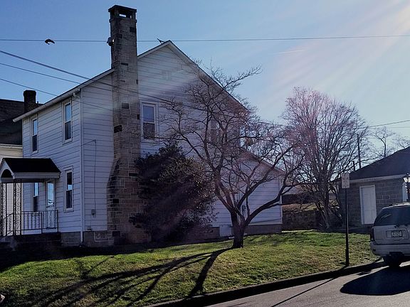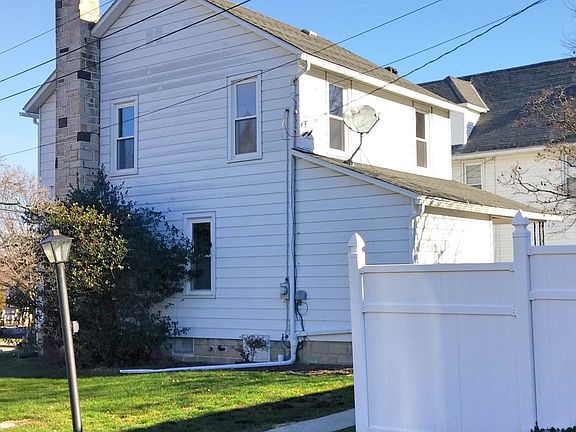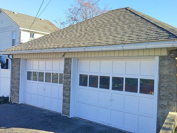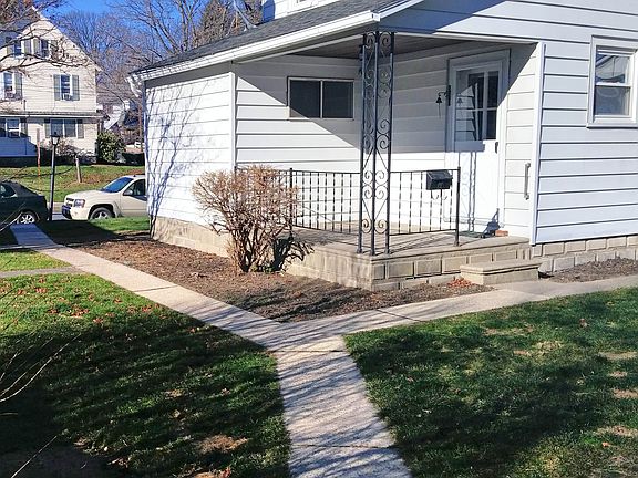 Corner lot Colonial home offering 2 large bedrooms, 2 full bathrooms, 2 car detached garage, living room with fireplace, dining room and kitchen. The kitchen has a dishwasher, refrigerator and electric oven and flows directly into the spacious dining room that is open to the living room. There is a stone hearth wood burning fireplace in the living room. The 2nd floor has 2 large bedrooms with wall to wall carpet, ceiling fans and closets. The full bathroom has a new tile surround in the shower and resilient flooring. Another full bathroom on the first floor has tile surround with a tub/shower. The detached 2 car garage is large enough for a small work area plus there is also on street parking.