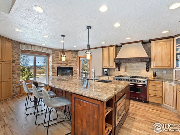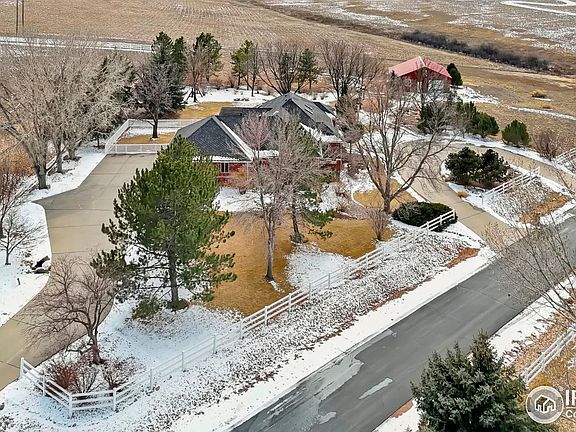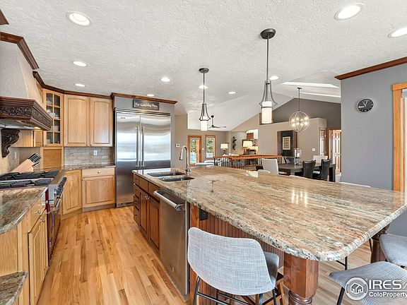 Welcome to your private retreat on a stunning 2.17-acre equestrian property, with horse barn, in the Windsong neighborhood, just minutes from the heart of Windsor. The chef's kitchen features Viking appliances, including a new built-in refrigerator (2024), dishwasher (2024), and 48" range. The large island is perfect for entertaining while the gas fireplace adds the perfect ambience. Enjoy mountain sunsets from the window seat or grilling patio with a built-in Viking grill. The owner's suite has a private deck with stunning mountain views, the remodeled bath includes a free-standing tub, large shower with 5 showers heads, quartz countertops, and a custom closet. The open-concept main level offers vaulted ceilings, a dining room with mountain vistas, and family room with a gas fireplace and custom built-ins. Two guest bedrooms, an updated bath, powder room, & laundry room complete the main floor. The finished walkout basement has a third gas fireplace, wet bar, two add'l bedrooms, a flex room, a remodeled bathroom, and two storage rooms. Outside, enjoy expansive mountain views, five outdoor living areas, a circular driveway for guest parking, plus a private driveway leading to your 1,000+ sq ft, 3-car garage with custom storage. The horse-ready barn is 35' x 28' (1044 sq ft) and includes a tack room, two stalls, a chicken coop, and room for outdoor equipment or a camper. Additional storage is provided by a shed, and drip lines are in place for a garden. This well maintained home features a low-maintenance brick exterior, Andersen windows, Trex decking, refinished wood floors (2024), Class IV shingles (2019), a 98% efficient furnace (2016), newer A/C (2021), tankless hot water heater, humidifier (2025), and whole-house fan. No Metro tax and low HOAs complete this peaceful oasis. Located 10 minutes from Windsor and I-25, with easy access to Fort Collins, Loveland, and Greeley, this home offers the perfect blend of privacy and convenience.