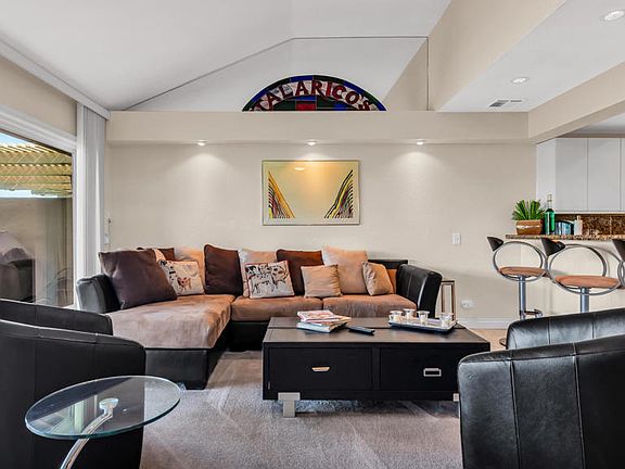 The location of this unit is one of the most sought after in Woodhaven Country Club. Located on the 7th fairway, about 90 ft to the green, the position is perfect. When sitting on the patio, the breathtaking view span across 5 fairways framing the San Jacinto and Santa Rosa Mountains. This unit is being sold turnkey furnished! (With a few personal exclusions, ask for list). All big-ticket items have been complete. New window package on back, new Durawood awning, upgraded HVAC, lighting, stainless steel appliance, new stackable washer and dryer, new carpet in bedrooms, travertine throughout the other living spaces. The den is furnished as a 3rd bedroom with a new dedicated bath nearby, and if that isn't enough, the golf cart is included!! Contact the listing agent for your personal showing.