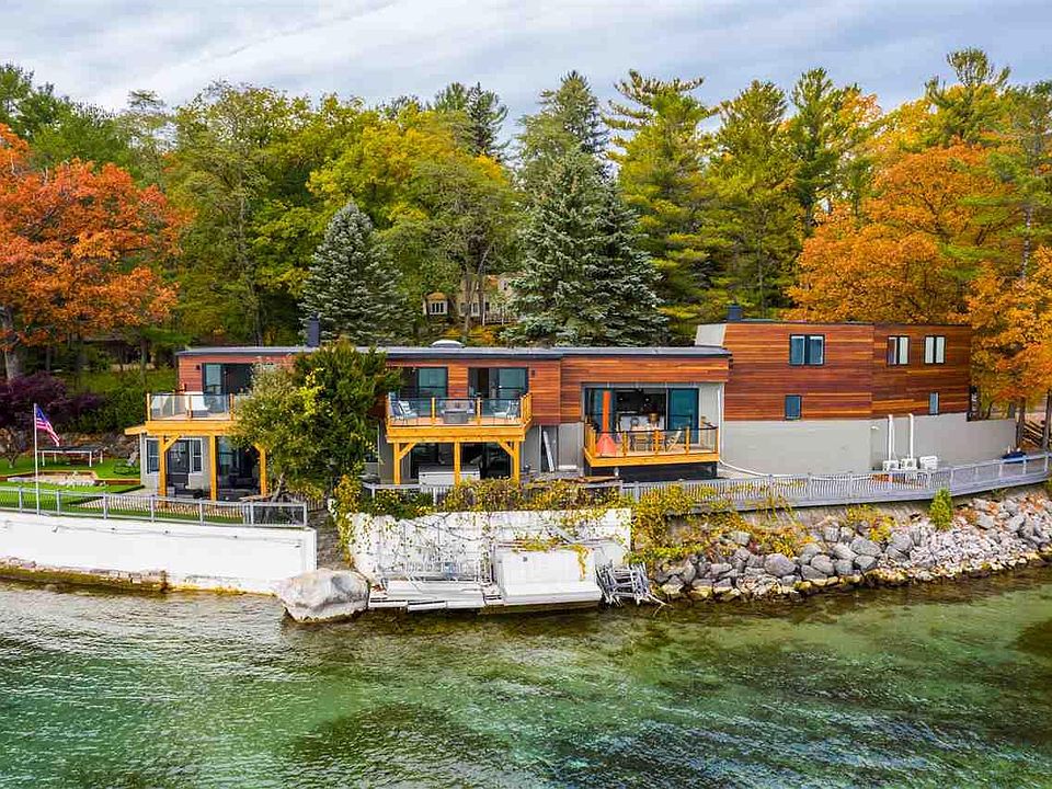 MOVE IN READY, This waterfront, mid-century modern, smart home on Old Mission Peninsula features heated floors throughout, a cooks kitchen with top of the line appliances, a generous master suite. 3 large cedar decks, a flagstone patio, and trex deck wrap along the back of the house makes this the perfect home for entertaining! Enjoy a 270 degree view of East Grand Traverse Bay! Mooring for a yacht up to 80ft, Redwood siding that is absolutely stunning, zero lawn maintenance, and a guest suite with a full kitchen and bath. So whether you want to sit back and relax or entertain the night away, this is the home for you!