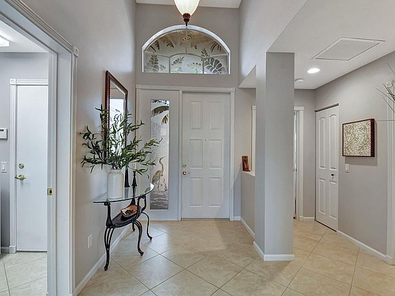South Pacific Great room floor plan on private corner lot in Resort style 55+ Valencia Shores. Upgraded Granite Kitchen, vaulted ceiling, recessed lighting, neutral diagonal tile in living areas, taupe carpet in bedrooms. 3rd BR/Den has custom desk built in. Guest Bath has tub/shower combo w/handicap bar. Screened patio with a glimpse of the lake. All closets are customized. Upgraded primary Bath with Listello accents. Garage with new epoxy floor. HOA fees include Internet, cable with 1 DVR, alarm, and line telephone, outside of house painted every 6-7 years, roofs cleaned about every 3 years, lawn services, 2 staffed 24/7 guard houses, separate Social & Athletic clubhouses. Social Club 2 blocks away! New water heater 2024! Portable Generator Valencia Shores more! This home is located at Valencia Shores, rated as one of the top 55+ communities in the USA! Social Director, Athletic Director, full time Tennis Pro. All working to help make "camp" just what you want it to be! 10 hard tru tennis courts, 2 racquetball courts, 6 pickle ball courts, 2 bocce courts, new state of the art gym, steam & sauna, indoor and outdoor spa, social pool, resistant pool and lap pool. Social hall for shows, card rooms, billiards rooms, art & craft room and new cafe. This is resort style living all in your backyard! Bring your grill and enjoy the good life! Must see!