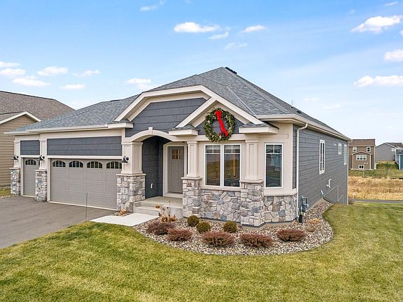 Custom Built Walk Out Rambler on best lot in Avonlea! Great views of walking path & wild prairie grass, provides space and privacy from neighbors. A+ curb appeal with four sides of LP siding & cultured stone accents. Gray toned LVP flooring, white trim & white paneled doors. White kitchen includes pantry, 36 wooded hood that vents to exterior, pot filler faucet over cooktop, 8 ft island, quiet-close drawers & under cabinet lighting makes this kitchen very functional & modern. Flex room with bayed windows provides options of an office, library, music and/or living space. Finished, insulated & heated garage with laundry tub sink. Owners suite with cubed windows, walk-in shower & raised dual vanity. Unfinished lower level is framed & ready for your finishing touches to make this home your own. Quick closing possible!