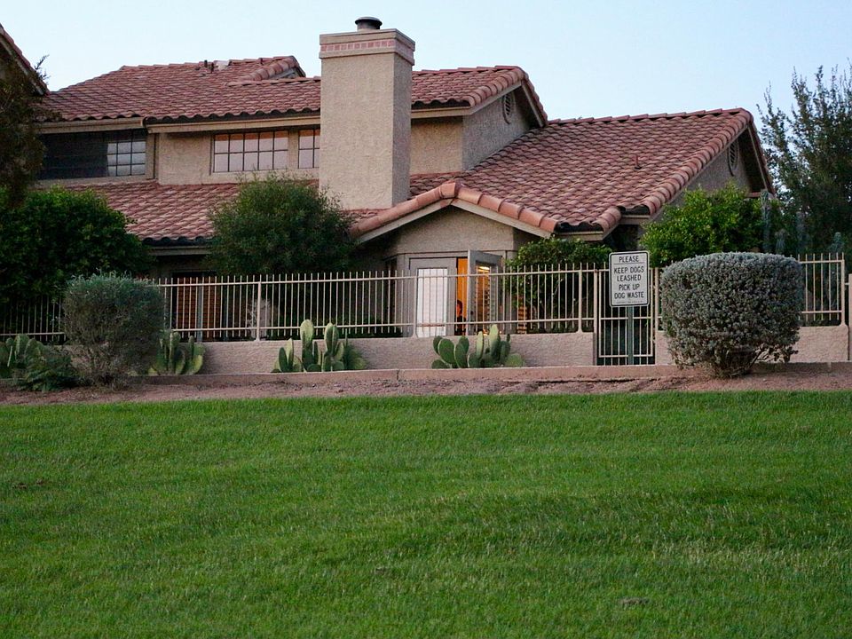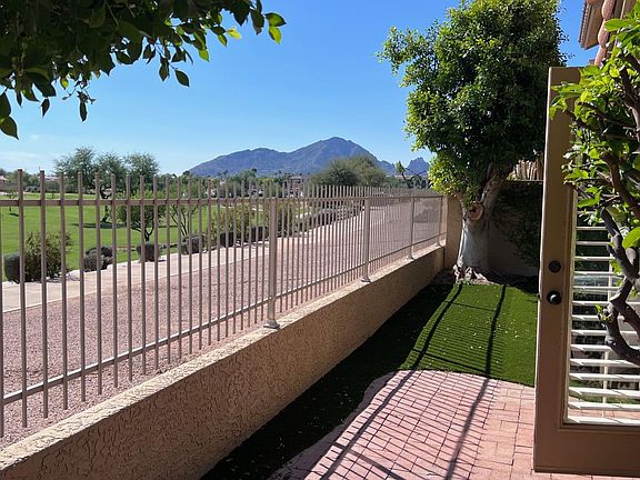 Rare opening in Camelview Greens gated community! Patio home sits on the 10th fairway of Silverado's championship golf course with views of Camelback Mountain. This La Jolla single level floor plan features a two car garage, two bedrooms, a den/office, and two bathrooms. Saltillo tile and Brazilian cherry wood floors throughout, plantation shutters on all windows and sliding doors. Bright and sunny gourmet chef's kitchen with solid black granite slab countertops, commercial sink and faucet, subway tile backsplash, a hanging pot rack, and stainless steel appliances. Wood burning fireplace and cathedral ceiling in living room. Private patio gate leads out to the Silverado Golf Club, the Indian Bend Wash Greenbelt (paved exercise path traversing 11 miles through parks, lakes, and golf courses), and the Arizona Canal Trail (fishing, running trails, and bike paths stretching over 60 miles along the canals). The community features two pools (one is heated all winter) and a jacuzzi. Scottsdale living at its finest! No pets. No smoking. Renter is responsible for water/trash and electricity.