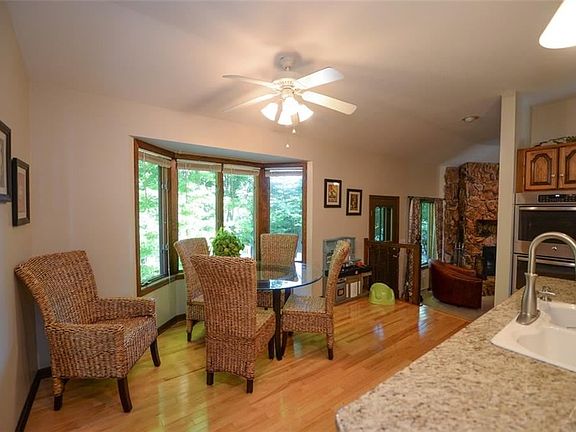 Contemporary home on 9 acres farm offering privacy and a beautiful setting! Well-maintained home with unique floor plan. Spacious great room with large stone hearth fireplace and balcony area. Open Kitchen has hardwood floors, refinished hickory cabinets, new tile backsplash and granite countertops, newer stainless steel appliances include cook top range and double oven! Eat-in kitchen area with bay window and french doors that open to formal dining and living area. Main floor also has updated half bath and guest bedroom/office. Second floor offers 3 bedrooms and two bathrooms including a master suite with fully remodeled bathroom and a walk in closet. One of the other bedrooms opens to a large, private upper deck connecting to the family room balcony! Basement is mostly finished and updated including two bedrooms, a new 3/4 bathroom, new kitchenette and lots of open space. Outbuildings include a barn with two horse stalls, open area and storage loft. Also has a newer 960 sq ft workshop, fully insulated with a wood burning stove and the concrete floor has an underlying vapor barrier. Approximately 2.5 acres are fenced. Additional open pasture area, woods and extensive orchard complete the acreage. Lots of recent updates! Newer light fixtures throughout the home, new granite countertops everywhere, most rooms recently painted. A must see!