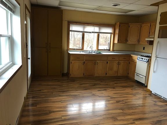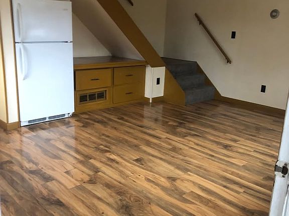 First floor has enclosed entryway and open concept floor plan. Kitchen area includes double sink, small gas stove and refrigerator. Upstairs has spacious bedroom, large closet, and bathroom. Bathroom includes shower stall, linen closet, and of course toilet and sink. Lots of storage and spacious feel for the size. Lovely sunset view of the hills from bedroom windows. Includes off street parking. Perfect for a couple or single individual. No Pets. No smoking inside. Water and Sewer included. First month's rent + Deposit of $650 due before occupancy. Unit is occupied thru end of April and will not be shown until after then. Earliest occupancy is Mid May Apartment #1 is now available.