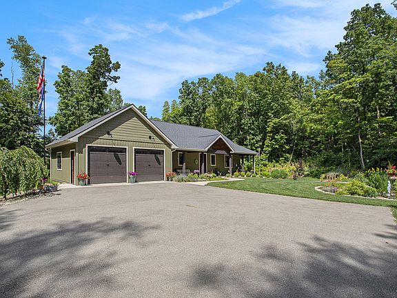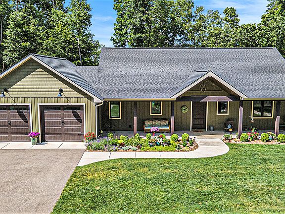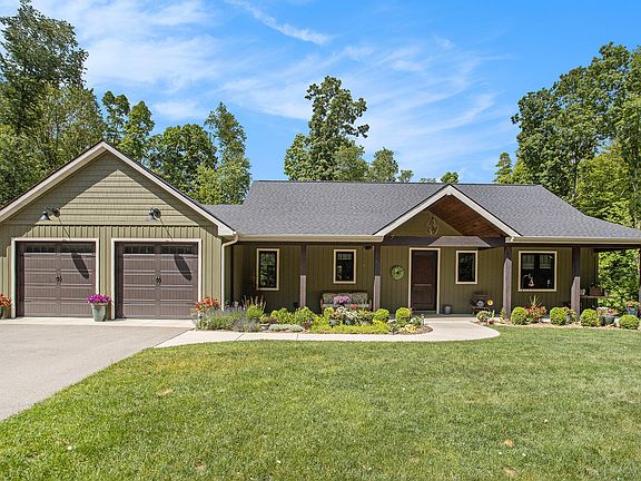 This stunning 4-bed, 2.5-bath home offers 2,800 sqft of beautifully finished living space, designed for comfort and elegance. Enjoy breathtaking views from the expansive deck or relax in the screened-in porch while watching the surrounding wildlife. Inside, the home features lvp flooring throughout, soaring cathedral ceilings, and plastered walls. The spacious kitchen boasts a large island and abundant cabinet/counter space. The luxurious primary suite includes an ensuite with upscale finishes. A finished walkout basement adds even more versatile living space, and two separate 2-car garages provide ample room for vehicles, storage, or hobbies. Located on 4.89 private acres with fiber optic internet, this property offers the perfect blend of modern convenience and quiet country living.