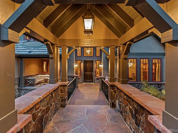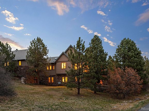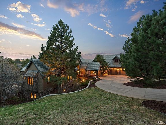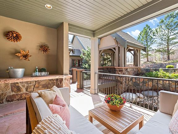 (VIDEO-www.779capilanoct.com) This beautiful Castle Pines Village home is waiting for you. GOLFERS? This property comes with the opportunity to avoid the long wait list and immediately purchase a full golf membership at The Country Club of Castle Pines. Buyer(s) will need to be vetted & approved by the Club for membership. Truly spectacular custom home nestled on a private and expansive treed lot overlooking Castle Rock with direct views of Pikes Peak and the Rocky Mountains. Impeccably well-maintained home located on a quiet cul-de-sac. Beautiful craftsmanship throughout from the wood ceiling beams to the wide plank walnut hardwood floors to custom mantles & coffered ceilings. The front private patio is a perfect place to relax by the waterfall/stream. The chef's kiss gourmet kitchen includes a Dacor 6-burner gas stove and double ovens, custom William Ohs cabinets, 48" Sub-zero refrigerator, 2 Bosch dishwashers, stunning countertops, 3" thick walnut top at island & tons of storage. The main floor boasts a cozy hearth room with a 2-sided fireplace and built-in entertainment center, kitchen with eating space, huge laundry room, large dining room with extensive molding and large windows overlooking the pond, butler’s pantry, wet bar with wine closet, huge family room with vaulted beamed ceilings and floor to ceiling windows overlooking Castle Rock. The master suite is spacious and includes a private balcony, gas fireplace, 5-piece bath, jet tub, double sinks and vanities, huge custom walk-in closet. The top floor includes an open loft space and 5th bedroom/office with fireplace & en-suite 3/4 bath. The huge walkout basement includes 3 additional spacious en-suite bedrooms, a wet bar with beautiful cabinetry/counters, billiard room, family room with drop down theater screen, full surround sound and black out curtains. Amazing sport court for hours of fun. This home is set in a quiet, private pocket of The Village with easy access to highways, restaurants and shopping.