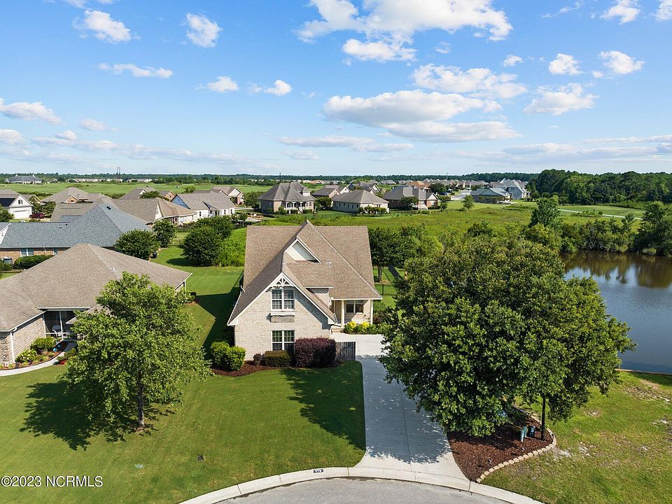 Stunning 2,568 square-foot brick home nestled at the end of a quiet cul-de-sac in the desirable gated community of Castle Bay in Hampstead. With 3 bedrooms, a large flex room, and 2.5 bathrooms, this home has everything you could want! Situated on an impressive .74 acre lot including ¼ of the pond, you'll enjoy the tranquility of watching wildlife graze by from the privacy of your covered porch and fenced-in backyard. The lot wraps around the front of the pond providing more privacy. Premium features include maple floors, crown molding, and 9-foot ceilings throughout the first level, a bright and airy open floor plan, formal dining room, and a first floor master suite. The premier kitchen features granite countertops, soft-close cabinetry, solid wood cabinets with 42'' uppers, stainless steel appliances, and a sizable breakfast bar. Your impressive first-floor master suite boasts a lighted tray ceiling, large walk-in closet, and an en suite bathroom with dual vanities, a makeup counter, linen closet, a jetted tub, and walk-in shower. With private access to your porch from the master, you can relax with a beverage in the evening before turning in for the night. A gorgeous archway leads to the breakfast nook or sitting area at the front of the home, adjacent to the formal dining room. Upstairs, you'll find two spacious guest bedrooms, a full bathroom with dual vanities, a large walk-in closet, and a generous space that can be used as an office, playroom, home gym, or flex room. Additional features include a beautiful marble tiled gas fireplace, epoxy flooring in the two-car garage, metal fence in the backyard, and mature landscaping. Castle Bay offers a variety of membership packages including access to the 18-hole golf course, fitness center, tennis courts, swimming pool, and full service bar. Located just a short drive to dining, shopping, and entertainment options, this community has everything you're looking for. Call today to make this exquisite home yours!
