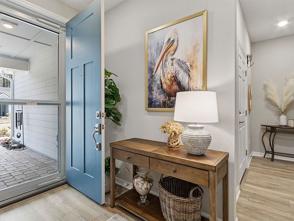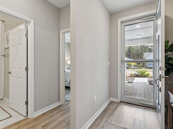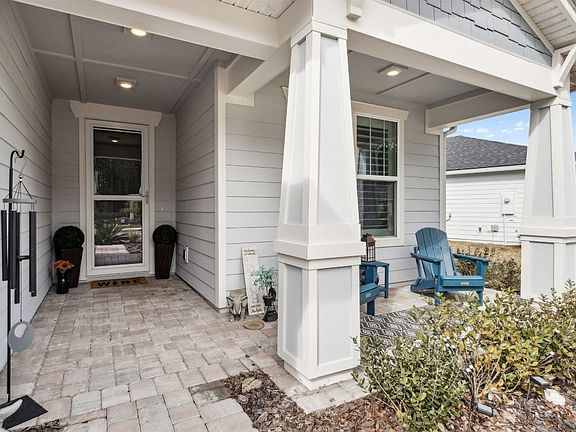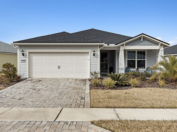 COASTAL INSPIRED DEL WEBB WILDLIGHT HOME WITH POND VIEW! This 2 bedroom, 2 bath home plus flex room with OVERSIZED DEEP 2+ CAR GARAGE (room for golf cart!) shows better than new. Located in the desirable Del Webb Wildlight 55+ active adult community with ample outdoor enjoyment plus health & wellness focused activities. The gated, natural gas community is rich in RESORT STYLE AMENITIES catering to the active and social lifestyle. Well manicured landscaping and a paver drive welcome you to this single-story Pulte home. The "Mystique" design is the perfect blend of style and functionality. Wood style LVP flooring and 8' doors complement the optimal open plan with spacious gathering room, tray ceiling and triple pocket sliding glass door access to lanai + extended patio with peaceful pond views! The gourmet kitchen features quartz counters and island with bar, 42" upper cabinets, 6 burner gas cooktop, and walk in pantry. Ample space in the owner's suite features a walk in tile shower with double shower heads, spacious double vanity and walk-in closet. The secondary bedroom is ideal for hosting guests. Enjoy the versatility of flex room just off the foyer that can serve as an extra bedroom or office. Additional highlights include a drop zone, laundry room, and on demand water heater. PARTIALLY FURNISHED & PRICED TO SELL!! Amenities include a spectacular Horizon Club, zero-entry outdoor pool & spa w/ lap lanes, 10+ miles of nature trails, pickleball, tennis, and bocce courts, fitness center, tavern & grille, private wine lockers, covered social pavilion, dog park, community garden and more! Located close to dining, shopping and healthcare. Short drive to Amelia Island & Historic Fernandina Beach + easy access to Jacksonville.