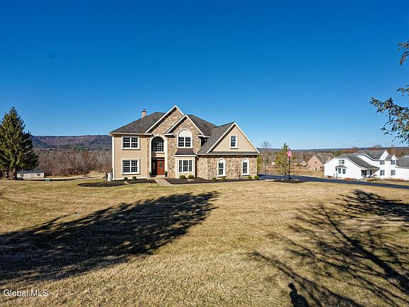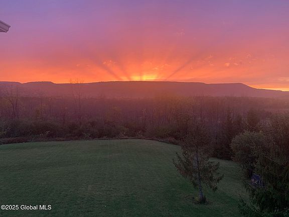 Sit on your back deck & take in breathtaking sunsets w/stunning views of the Helderberg Escarpment. This exceptional custom home on 7.2 acres offers superior craftsmanship & an unbeatable setting. 5+ bedrooms, 4.5 baths, & 1st floor office w/custom built-ins, luxurious primary suite features a tile shower, soaking tub, fireplace, Juliet balcony, & a sun-drenched sitting area. The expansive kitchen boasts granite counters, a new Sub-Zero fridge, & top-of-the-line finishes, opening to the living area & a bright breakfast nook. Enjoy the convenience of an oversized pantry & first-floor laundry. New(2023) heated saltwater in-ground pool w/ hot tub, stamped concrete patio, owned solar panels & a full full finished walk-out basement w/bedroom, bath, workout room and more! Can't be replicated !
