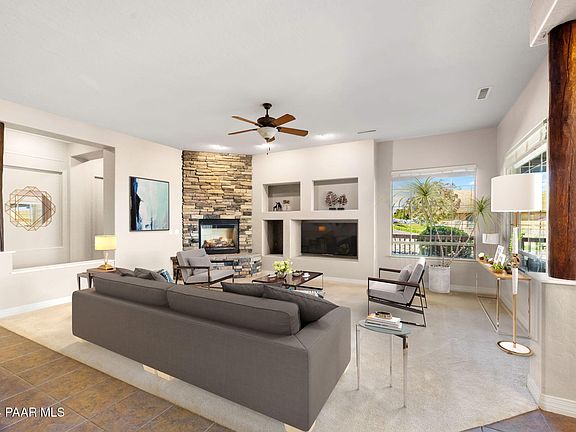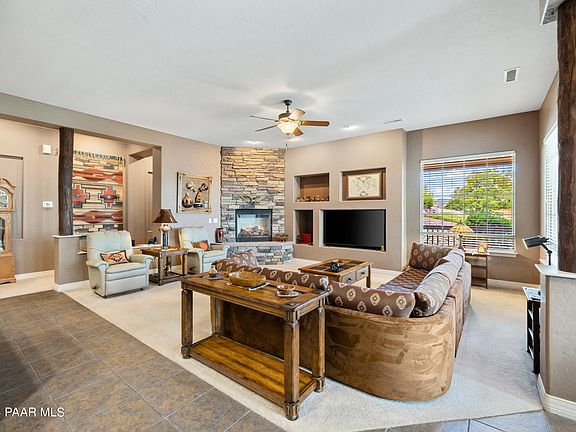 Welcome to your new home in the Summit of Prescott Lakes! This charming 2,348 sq. ft. ranch-style home, built by Carrington Homes in 2006, offers a perfect blend of comfort and elegance. The property features a heated paver driveway and an oversized, large wraparound open patio with level entry capturing views to Granite Mountain. Inside, you'll find three bedrooms with a split floor plan, two bathrooms, and a large family room with a stone fireplace, perfect for cozy gatherings. The private backyard is beautifully landscaped with a mature landscaping and elevated natural stone walls, providing serenity and privacy. Enjoy all the amenities Prescott Lakes has to offer from this delightful home. See the virtually staged photos lightening the walls to envision a lighter cream color.