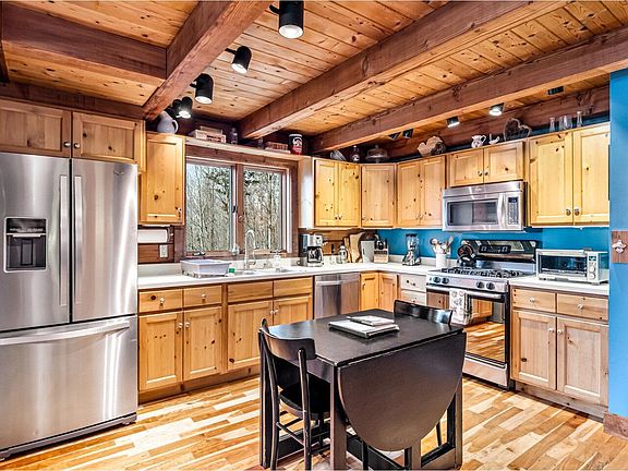 Welcome to your mountain escape! This cozy log cabin blends rustic charm with modern convenience, featuring an open-concept living area that combines the kitchen and dining space - perfect for hosting or relaxing in comfort. Large windows fill the home with natural light and showcase breathtaking views of the surrounding landscape. The kitchen comes equipped with sleek stainless steel appliances and plenty of counter space. Enjoy the beautiful blend of Douglas fir wood beams and cherry floors with the comfort of the gas stove. Upstairs offers two inviting bedrooms and a full bath, while a third bedroom is located on the main level - ideal for guests or a home office. A partial basement provides additional storage or workshop space. Step outside onto the screened-in porch, a perfect spot to enjoy your morning coffee, unwind in the evening, or simply take in the beauty of nature. High speed internet is available with Starlink or used Fidium Fiber which is can be hooked up from the road. Additionally, this property has the potential to be an excellent investment as a short term rental with gross rental income of over $54,000 in 2024. Whether you're looking for a weekend retreat, an investment, or full-time residence, this log cabin offers peace, privacy, and a view you'll never get tired of.
