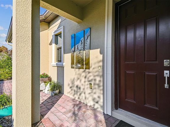This beautifully appointed 2023 Allora model offers 3 bedrooms, 2 bathrooms, a 2-car garage plus a coveted golf cart garage, all perfectly positioned near the Village Center amenities. Enjoy a serene water view and an open-concept layout with a dining area and NO CARPET — featuring ceramic wood-look tile throughout for both style and easy maintenance. The chef’s delight kitchen showcases a custom pantry, breakfast bar, tile backsplash, and pull-out double-level cabinet drawers, making both cooking and entertaining a pleasure. The spacious great room opens via sliders to a screened and covered lanai overlooking the tranquil water, creating the perfect indoor-outdoor living space. The primary suite also enjoys peaceful water views and includes an en-suite bathroom with double sinks, a large walk-in shower with built-in seat, and a custom-designed oversized walk-in closet. Guest bedrooms and the guest bathroom are thoughtfully split from the primary suite for added privacy. Step outside to your extended living area featuring a fenced-in patio with pavers, pet friendly artificial turf which is covered by a SunShade awning and a pet-friendly grass/carpet area — ideal for pets and relaxing or entertaining. Additional highlights include a laundry room with sink and cabinetry and a generous garage with ample storage plus the extra golf cart bay.(Golf Cart is available outside of offer contract) Built in 2023, this stress-free home comes with ROOF, HVAC, WATER HEATER, and APPLIANCES all 2023 — offering peace of mind and modern efficiency. A must-see home combining location, luxury, and low-maintenance living! All this in one of the top 55+ communities in America. Solivita offers residents access to state of the art amenities and work out facilities, dance and aerobics studios, a business center, 14 heated swimming pools, 2 heated spas, tennis courts, pickleball courts, shuffleboard, bocce ball, billiards room, art gallery, 3 restaurants and 2 championship 18-hole golf courses, driving range and putting course. Every day offers something new to explore and enjoy! This home also features easy access to nearby shops, dining, and health care, offering the perfect balance of privacy and lifestyle. Don't miss out on the opportunity to have a first class lifestyle.