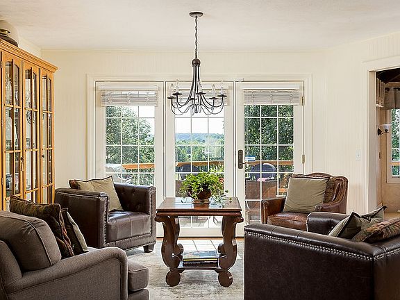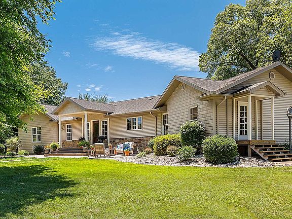 Private and picturesque country setting but close to town and only 26 miles north of Louisville KY in an award-winning school system. Breathtaking views of the tree lined drive, stocked pond, woods, farmland and wildlife from every window. Beautifully updated decor is move in ready. This 4-5 bedroom, 2 bath home is nestled on 20 wooded acres and includes 30 tillable acres of income-producing farmland. A large 4 bay garage with two additional garage doors (7' and 9' tall) garage doors in the back. Garage is detached and features ceiling fans, a climate-controlled workshop and lighted cupola, porch & bays. Natural light pours into every room of this open floor plan which offers generous entrance foyer, dining room, spacious custom kitchen with stainless appliances included and a large and unique hexagonal living room with exposed wood and beam cathedral ceiling and working stone fireplace. The home includes a gorgeous, spacious attached deck, large patio areas and above ground pool with enormous deck for beautifully landscaped outdoor living on every side of this idyllic property. Generous master bedroom suite is pure luxury boasting panoramic views plus a roomy walk-in closet, large master bath with toilet closet, soaking tub with separate shower, and dual cultured granite sinks. Two large additional bedrooms have large closets, a small bedroom would make a perfect office or nursery and bonus room with closet can serve as den, playroom, activity room or another bedroom. Second full bath features glassed shower and abundant custom cabinetry with dual cultured granite sinks as well. Impeccably updated interior with elegantly casual finishes makes this spotless property completely move-in ready. You won't find a more captivating, private and secluded property with stunning views.