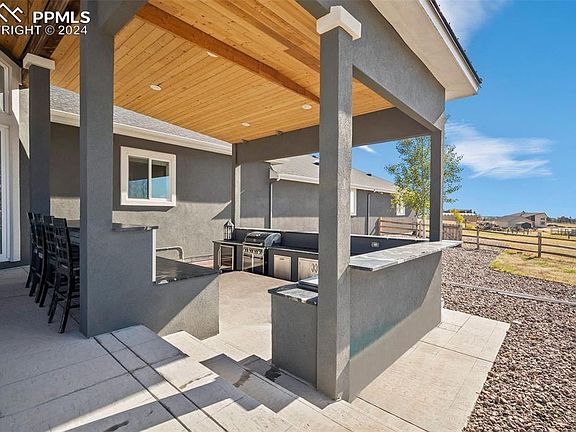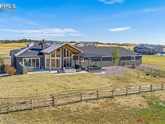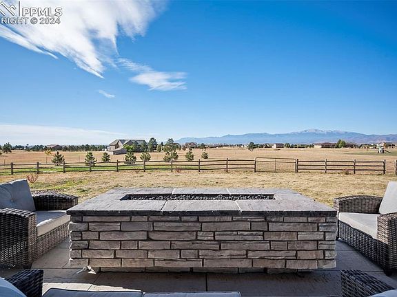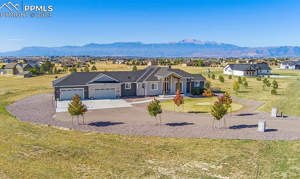 Immerse yourself in this quintessential Colorado retreat in Highland Park 3, where main-level living takes center stage on nearly 3-acres with awe-inspiring Pikes Peak views! The spacious and elegant residence welcomes you with a large great room, featuring floor-to-ceiling windows/sliders framing the picturesque mountain vista, a vaulted ceiling adorned with beams, luxurious vinyl flooring, and an inviting wood-burning fireplace. The gourmet kitchen boasts Cafe appliances, a gas cooktop with a double oven, an expansive Calacatta quartz island, an enormous 80SF walk-in pantry, a farmhouse sink, soft-close cabinetry, beverage bar, and a built-in buffet wall–creating an entertainment haven in this open-concept floor plan. The 7-car oversized garage is a dream. The mudroom/laundry area off the garage is equipped with a washer and dryer, sink, coat closet, cabinetry, built-in bench with cubbies, and an LG Style Clothes Steamer. The main level features a generously sized owner's suite with a large slider offering mountain views. The 5pc bath includes a double vanity, an oversized shower, a soaker tub, and a spacious walk-in closet. An office and a second bedroom with an attached full bath complete the main level. Descending to the lower level reveals an open family room, a game table area, and a wet bar. Two bedrooms are connected by a Jack & Jill bathroom, and there's a convenient half bath for guests. The basement also offers a large gym w/ BodyTech weight stack, and ample storage space. Outside, the back is designed for ultimate entertaining, featuring an exquisite, covered kitchen w/ bar seating, built-in grill, fridge, prep area, icebox, and sink. Enjoy the landscaping, designed for easy upkeep, a rear fenced backyard, and a firepit complete the space, offering a perfect setting to relish Colorado living and the breathtaking surrounding views. Located in school dist. 20, minutes away from all the city has to offer. This beautiful home is a must-see!